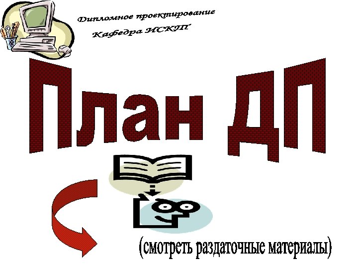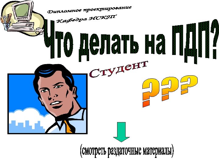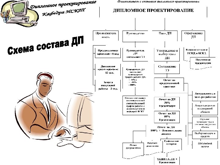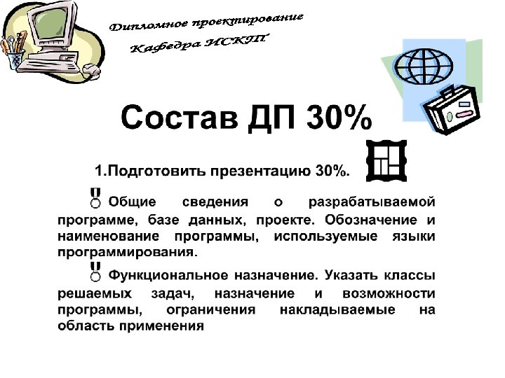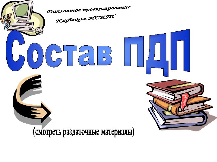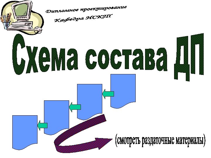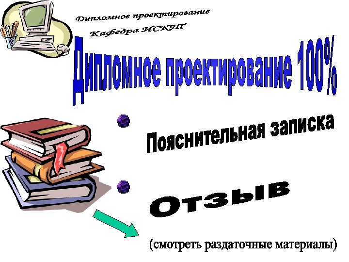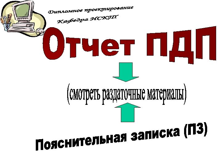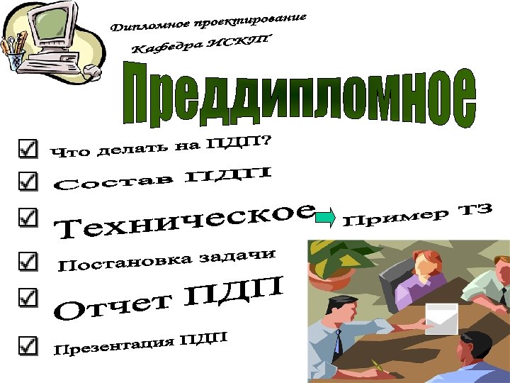 ПЗ дипломной работы Защита дипломной работы 7 Презентац ия 100% Руководств о оператора Рецензия Отзыв 8 1 ДП на конкурс Вопросы ГЭК 3 Дипломнику в дорогу 5 6 Дипломное проектиров ание 100% ПЗ дипломног о проектиров ания Отзыв руководител я ДП 2 Что делать на ПДП ? Преддипло мная практика (ПДП) 4 Дипломное проектирован ие 80% Состав дипломного проектирован ие 80% Презентац ия 80% Общие документы Дипломное проектирован ие 30% Состав ПДП Пример ТЗ Техническо е задание (ТЗ) Постановк а задачи Состав дипломного проектирован ие 30% Презентац ия 30% Отчет ПДП Пояснител ьная записка (ПЗ) Презентац ия ПДП Темы ДП График ДП План ДП Схема состава ДП Пример ПЗ Титульный лист ПЗ