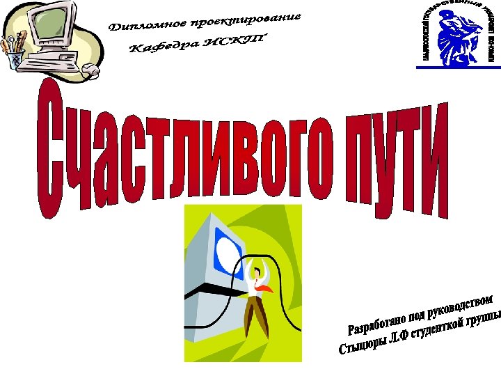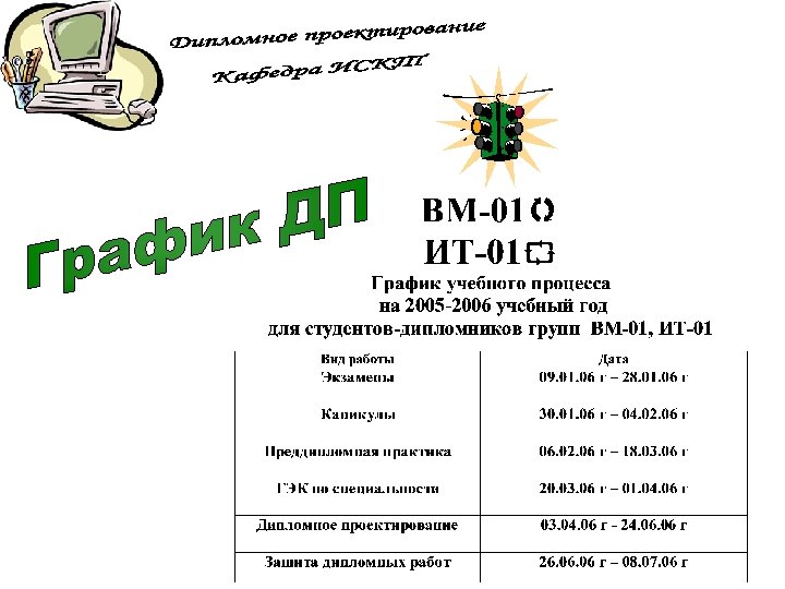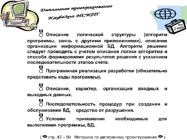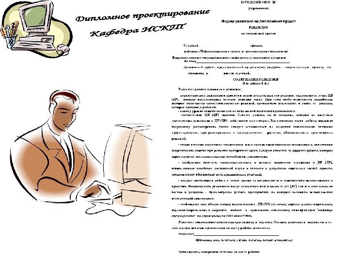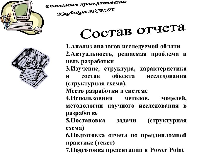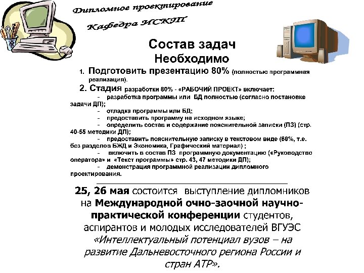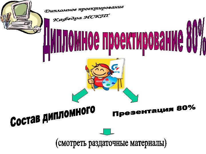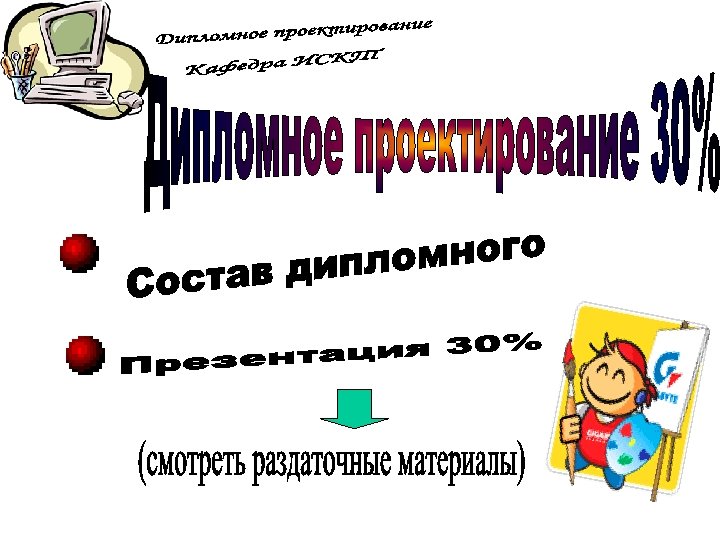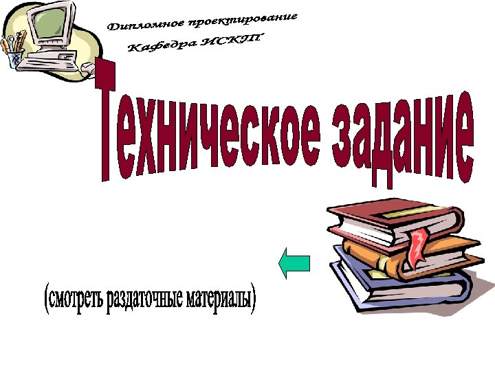 ПЗ дипломной работы Защита дипломной работы 7 Презентац ия 100% Руководств о оператора Рецензия Отзыв 8 1 ДП на конкурс Вопросы ГЭК 3 Дипломнику в дорогу 5 6 Дипломное проектиров ание 100% ПЗ дипломног о проектиров ания Отзыв руководител я ДП 2 Что делать на ПДП ? Преддипло мная практика (ПДП) 4 Дипломное проектирован ие 80% Состав дипломного проектирован ие 80% Презентац ия 80% Общие документы Дипломное проектирован ие 30% Состав ПДП Пример ТЗ Техническо е задание (ТЗ) Постановк а задачи Состав дипломного проектирован ие 30% Презентац ия 30% Отчет ПДП Пояснител ьная записка (ПЗ) Презентац ия ПДП Темы ДП График ДП План ДП Схема состава ДП Пример ПЗ Титульный лист ПЗ