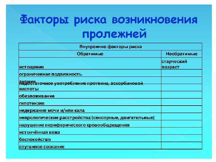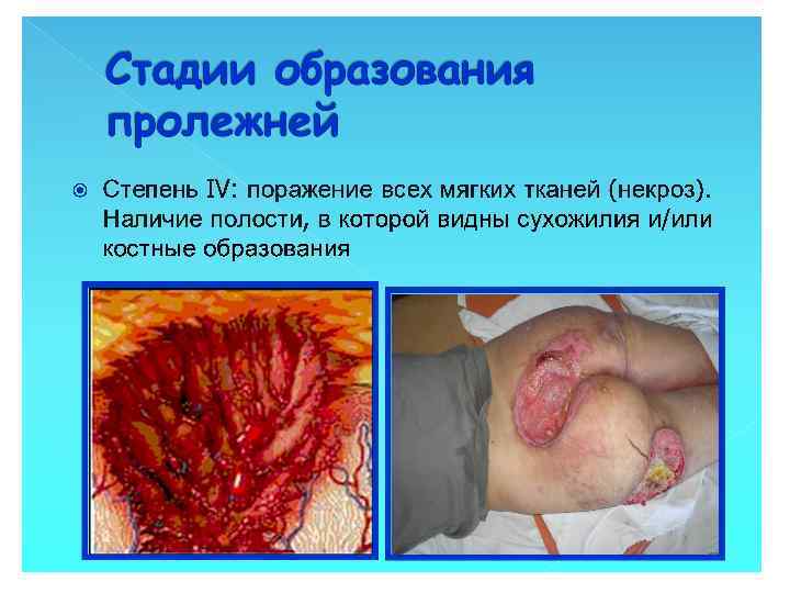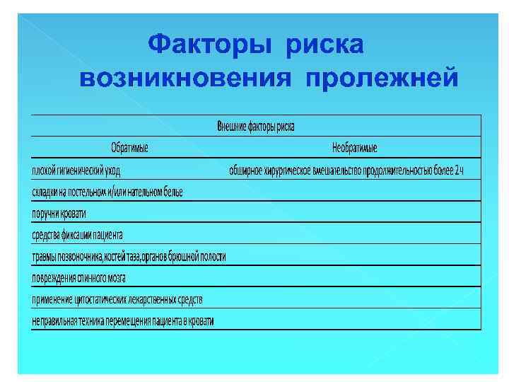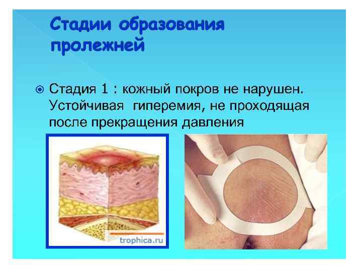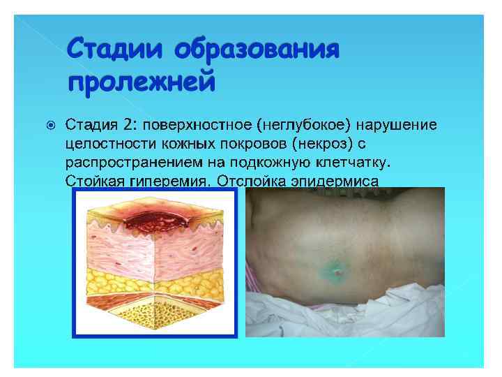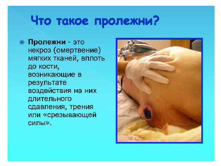 • При длительном постельном режиме и резком ослаблении организма пациента на участках кожи, подвергающихся давлению или трению тела, возникают пролежни.