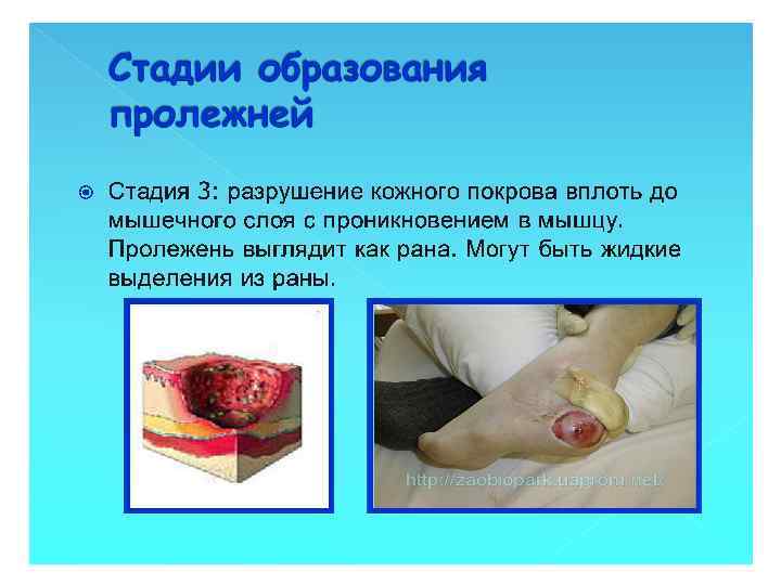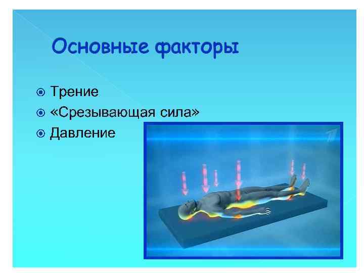 Причины образования пролежней 3 причина o Аналогичным образом пролежни могут образовываться и у слабых лежачих пациентов, которые, не имея упора в ногах, начинают медленно сползать по стулу или кровати из положения «сидя» или «полусидя» , что едва заметно глазу, но очень ощутимо для мягких тканей. Развивается пролежень.
