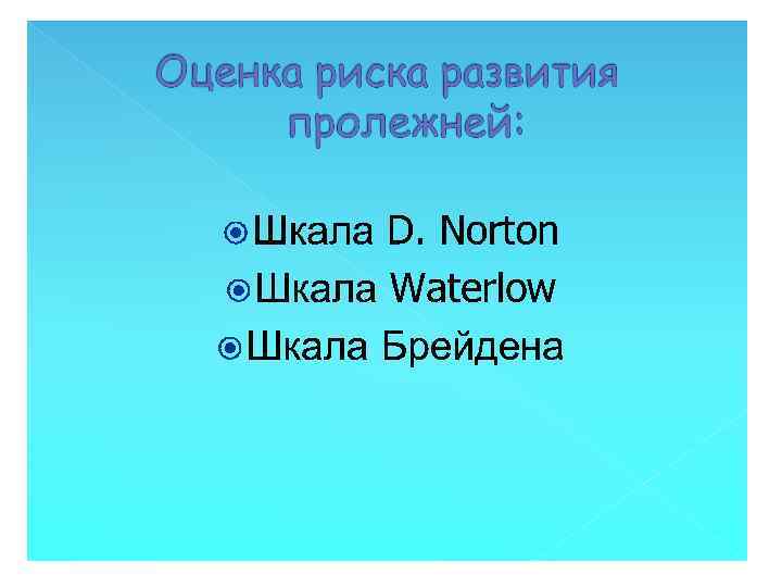 Профилактика пролежней • Специальные средства для ухода за лежачими больными должны включать обязательный минимум: • жидкость для очищения кожи без воды и мыла (очищает и заживляет одновременно), средства для предотвращения опрелостей (антибактериальные присыпки, особенно актуальны в теплое время года), • заживляющие кремы для кожи при появлении микроповреждений, потертостей, мелких трещинок, а также активный заживляющий крем для ухода за зоной промежности (при использовании подгузников).