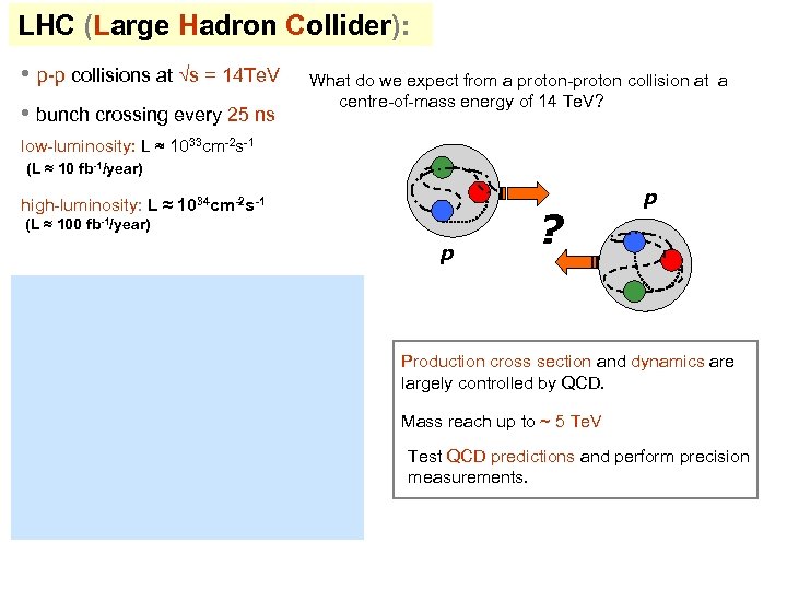LHC (Large Hadron Collider): • p-p collisions at √s = 14 Te. V • bunch crossing every 25 ns What do we expect from a proton-proton collision at a centre-of-mass energy of 14 Te. V? low-luminosity: L ≈ 1033 cm-2 s-1 (L ≈ 10 fb-1/year) high-luminosity: L ≈ 1034 cm-2 s-1 (L ≈ 100 fb-1/year) p ? p Production cross section and dynamics are largely controlled by QCD. Mass reach up to ~ 5 Te. V Test QCD predictions and perform precision measurements.