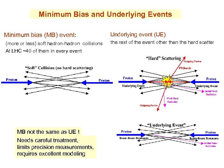 Minimum Bias and Underlying Events Minimum bias (MB) event: Underlying event (UE) (more or less) soft hadron-hadron collisions At LHC ~40 of them in every event the rest of the event other than the hard scatter MB not the same as UE ! Needs careful treatment, limits precision measurements, requires excellent modeling