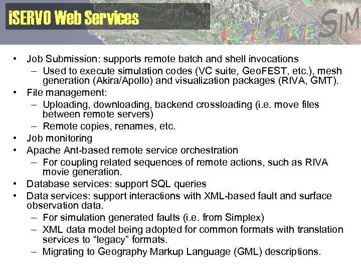 i. SERVO Web Services • Job Submission: supports remote batch and shell invocations – Used to execute simulation codes (VC suite, Geo. FEST, etc. ), mesh generation (Akira/Apollo) and visualization packages (RIVA, GMT). • File management: – Uploading, downloading, backend crossloading (i. e. move files between remote servers) – Remote copies, renames, etc. • Job monitoring • Apache Ant-based remote service orchestration – For coupling related sequences of remote actions, such as RIVA movie generation. • Database services: support SQL queries • Data services: support interactions with XML-based fault and surface observation data. – For simulation generated faults (i. e. from Simplex) – XML data model being adopted for common formats with translation services to “legacy” formats. – Migrating to Geography Markup Language (GML) descriptions.