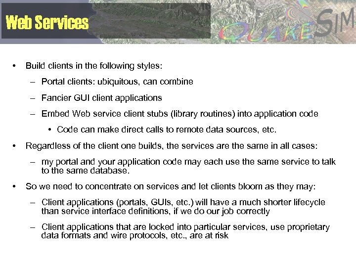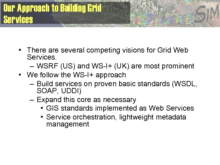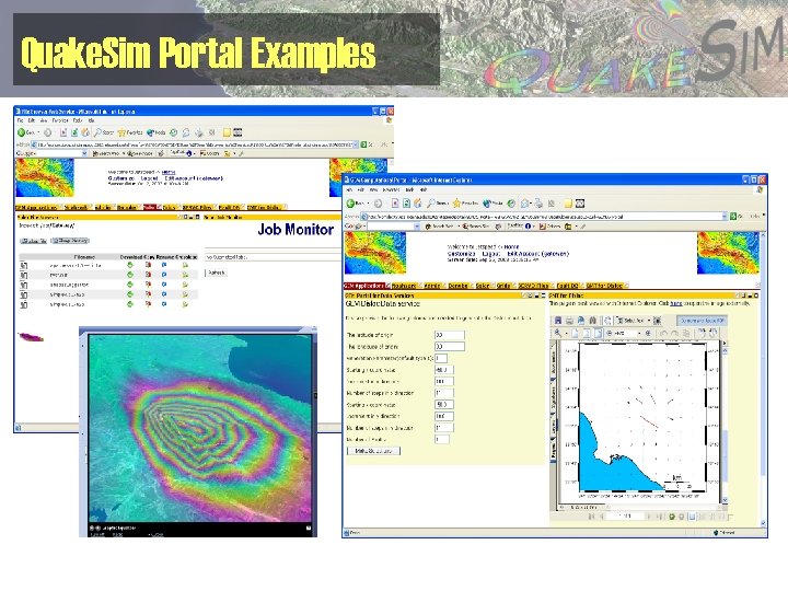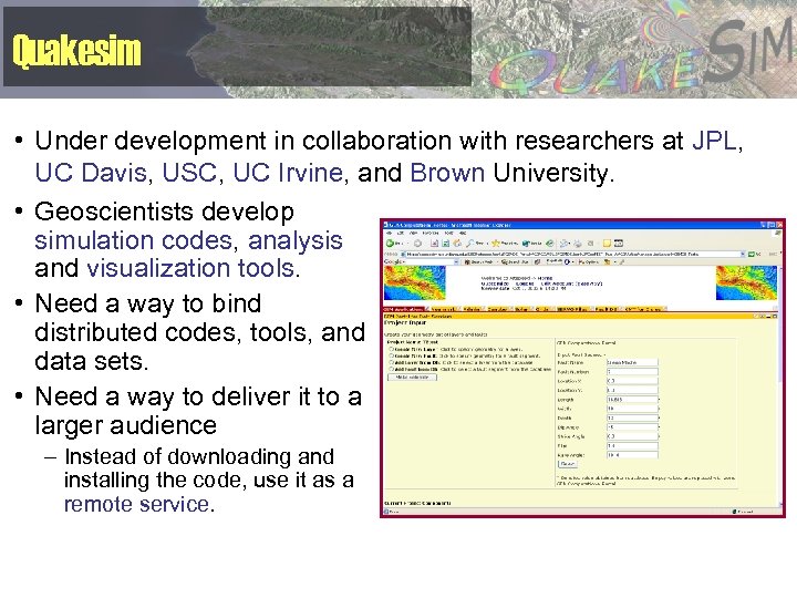 Quakesim • Under development in collaboration with researchers at JPL, UC Davis, USC, UC Irvine, and Brown University. • Geoscientists develop simulation codes, analysis and visualization tools. • Need a way to bind distributed codes, tools, and data sets. • Need a way to deliver it to a larger audience – Instead of downloading and installing the code, use it as a remote service.