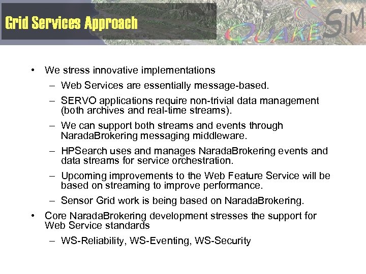 Grid Services Approach • We stress innovative implementations – Web Services are essentially message-based. – SERVO applications require non-trivial data management (both archives and real-time streams). – We can support both streams and events through Narada. Brokering messaging middleware. – HPSearch uses and manages Narada. Brokering events and data streams for service orchestration. – Upcoming improvements to the Web Feature Service will be based on streaming to improve performance. – Sensor Grid work is being based on Narada. Brokering. • Core Narada. Brokering development stresses the support for Web Service standards – WS-Reliability, WS-Eventing, WS-Security