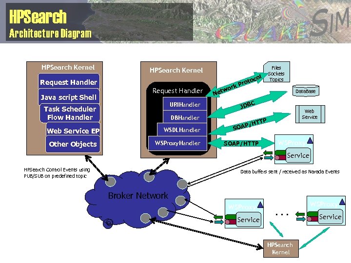HPSearch Architecture Diagram HPSearch Kernel Request Handler Java script Shell Request Handler URIHandler Task Scheduler Flow Handler Web Service EP Other Objects DBHandler WSDLHandler WSProxy. Handler ork w Net Files Sockets Topics l oco t Pro Data. Base C JDB Web Service TTP P/H SOAP/HTTP WSProxy Service HPSearch Control Events using PUB/SUB on predefined topic Data buffers sent / received as Narada Events Broker Network WSProxy Service . . . HPSearch Kernel WSProxy Service