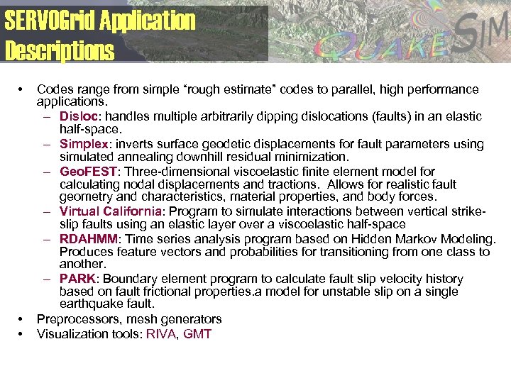 SERVOGrid Application Descriptions • • • Codes range from simple “rough estimate” codes to parallel, high performance applications. – Disloc: handles multiple arbitrarily dipping dislocations (faults) in an elastic half-space. – Simplex: inverts surface geodetic displacements for fault parameters using simulated annealing downhill residual minimization. – Geo. FEST: Three-dimensional viscoelastic finite element model for calculating nodal displacements and tractions. Allows for realistic fault geometry and characteristics, material properties, and body forces. – Virtual California: Program to simulate interactions between vertical strikeslip faults using an elastic layer over a viscoelastic half-space – RDAHMM: Time series analysis program based on Hidden Markov Modeling. Produces feature vectors and probabilities for transitioning from one class to another. – PARK: Boundary element program to calculate fault slip velocity history based on fault frictional properties. a model for unstable slip on a single earthquake fault. Preprocessors, mesh generators Visualization tools: RIVA, GMT