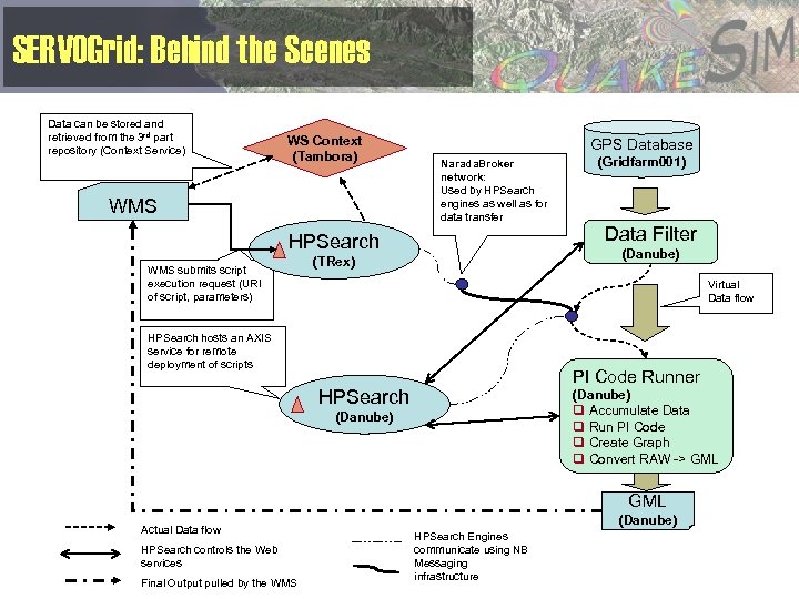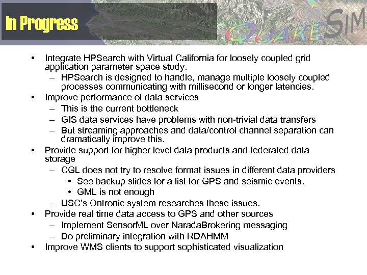 In Progress • • • Integrate HPSearch with Virtual California for loosely coupled grid application parameter space study. – HPSearch is designed to handle, manage multiple loosely coupled processes communicating with millisecond or longer latencies. Improve performance of data services – This is the current bottleneck – GIS data services have problems with non-trivial data transfers – But streaming approaches and data/control channel separation can dramatically improve this. Provide support for higher level data products and federated data storage – CGL does not try to resolve format issues in different data providers • See backup slides for a list for GPS and seismic events. • GML is not enough – USC’s Ontronic system researches these issues. Provide real time data access to GPS and other sources – Implement Sensor. ML over Narada. Brokering messaging – Do preliminary integration with RDAHMM Improve WMS clients to support sophisticated visualization