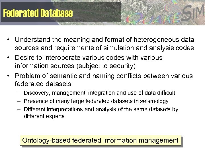 Federated Database • Understand the meaning and format of heterogeneous data sources and requirements of simulation and analysis codes • Desire to interoperate various codes with various information sources (subject to security) • Problem of semantic and naming conflicts between various federated datasets – Discovery, management, integration and use of data difficult – Presence of many large federated datasets in seismology – Different interpretations and analysis of the same datasets by different experts Ontology-based federated information management
