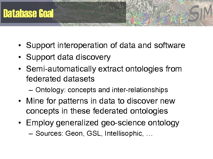 Database Goal • Support interoperation of data and software • Support data discovery • Semi-automatically extract ontologies from federated datasets – Ontology: concepts and inter-relationships • Mine for patterns in data to discover new concepts in these federated ontologies • Employ generalized geo-science ontology – Sources: Geon, GSL, Intellisophic, …