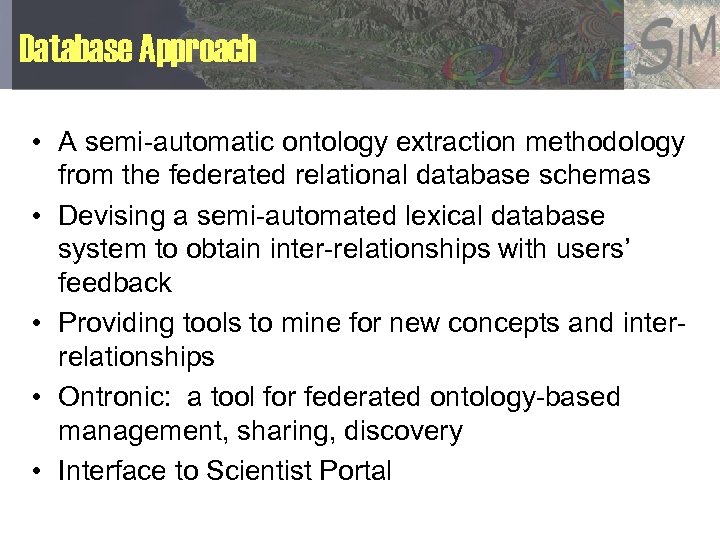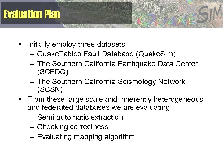 Evaluation Plan • Initially employ three datasets: – Quake. Tables Fault Database (Quake. Sim) – The Southern California Earthquake Data Center (SCEDC) – The Southern California Seismology Network (SCSN) • From these large scale and inherently heterogeneous and federated databases we are evaluating – Semi-automatic extraction – Checking correctness – Evaluating mapping algorithm