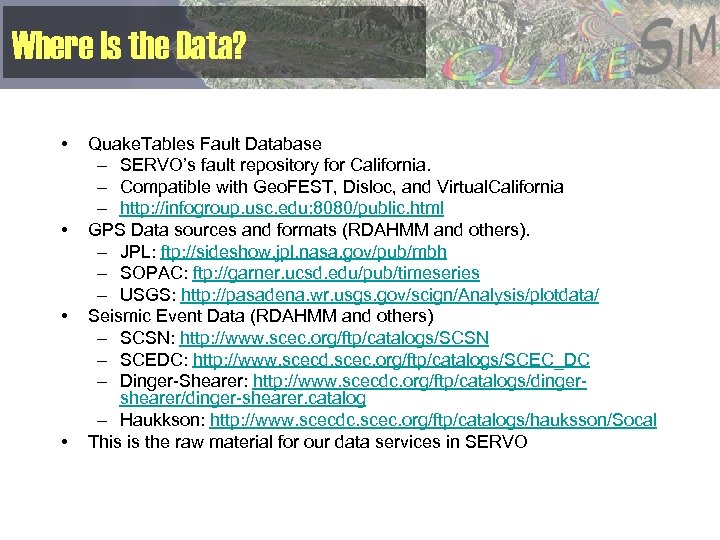 Where Is the Data? • • Quake. Tables Fault Database – SERVO’s fault repository for California. – Compatible with Geo. FEST, Disloc, and Virtual. California – http: //infogroup. usc. edu: 8080/public. html GPS Data sources and formats (RDAHMM and others). – JPL: ftp: //sideshow. jpl. nasa. gov/pub/mbh – SOPAC: ftp: //garner. ucsd. edu/pub/timeseries – USGS: http: //pasadena. wr. usgs. gov/scign/Analysis/plotdata/ Seismic Event Data (RDAHMM and others) – SCSN: http: //www. scec. org/ftp/catalogs/SCSN – SCEDC: http: //www. scecd. scec. org/ftp/catalogs/SCEC_DC – Dinger-Shearer: http: //www. scecdc. org/ftp/catalogs/dingershearer/dinger-shearer. catalog – Haukkson: http: //www. scecdc. scec. org/ftp/catalogs/hauksson/Socal This is the raw material for our data services in SERVO