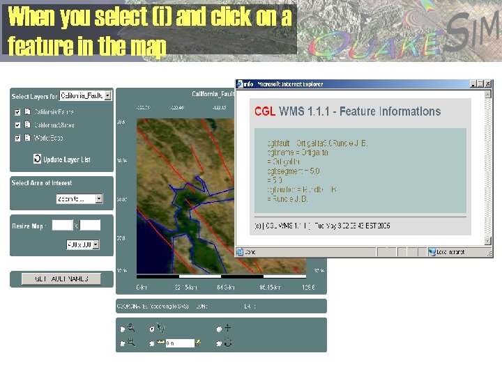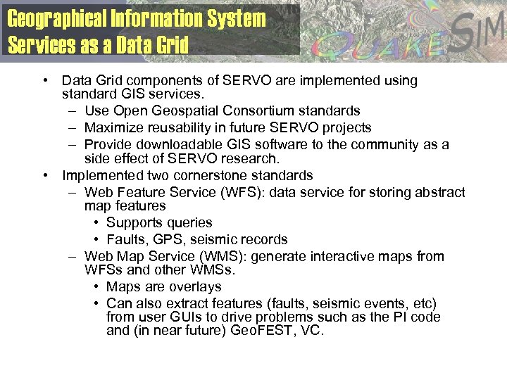Geographical Information System Services as a Data Grid • Data Grid components of SERVO are implemented using standard GIS services. – Use Open Geospatial Consortium standards – Maximize reusability in future SERVO projects – Provide downloadable GIS software to the community as a side effect of SERVO research. • Implemented two cornerstone standards – Web Feature Service (WFS): data service for storing abstract map features • Supports queries • Faults, GPS, seismic records – Web Map Service (WMS): generate interactive maps from WFSs and other WMSs. • Maps are overlays • Can also extract features (faults, seismic events, etc) from user GUIs to drive problems such as the PI code and (in near future) Geo. FEST, VC.