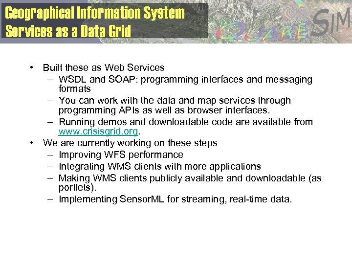 Geographical Information System Services as a Data Grid • Built these as Web Services – WSDL and SOAP: programming interfaces and messaging formats – You can work with the data and map services through programming APIs as well as browser interfaces. – Running demos and downloadable code are available from www. crisisgrid. org. • We are currently working on these steps – Improving WFS performance – Integrating WMS clients with more applications – Making WMS clients publicly available and downloadable (as portlets). – Implementing Sensor. ML for streaming, real-time data.