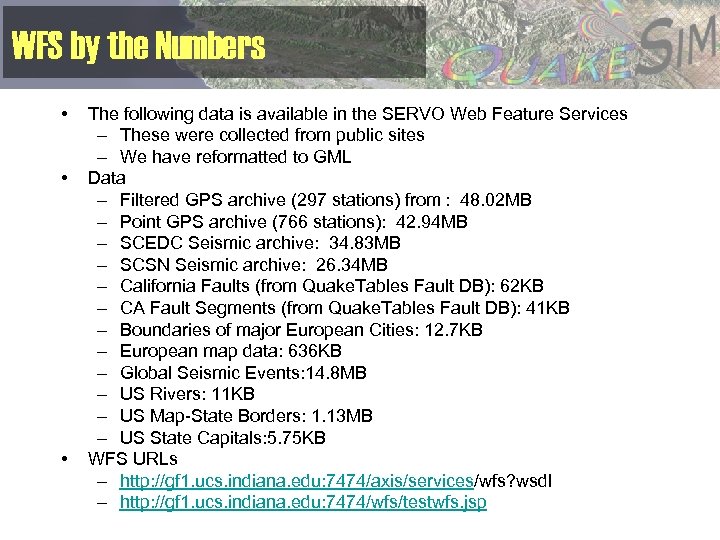 WFS by the Numbers • • • The following data is available in the SERVO Web Feature Services – These were collected from public sites – We have reformatted to GML Data – Filtered GPS archive (297 stations) from : 48. 02 MB – Point GPS archive (766 stations): 42. 94 MB – SCEDC Seismic archive: 34. 83 MB – SCSN Seismic archive: 26. 34 MB – California Faults (from Quake. Tables Fault DB): 62 KB – CA Fault Segments (from Quake. Tables Fault DB): 41 KB – Boundaries of major European Cities: 12. 7 KB – European map data: 636 KB – Global Seismic Events: 14. 8 MB – US Rivers: 11 KB – US Map-State Borders: 1. 13 MB – US State Capitals: 5. 75 KB WFS URLs – http: //gf 1. ucs. indiana. edu: 7474/axis/services/wfs? wsdl – http: //gf 1. ucs. indiana. edu: 7474/wfs/testwfs. jsp