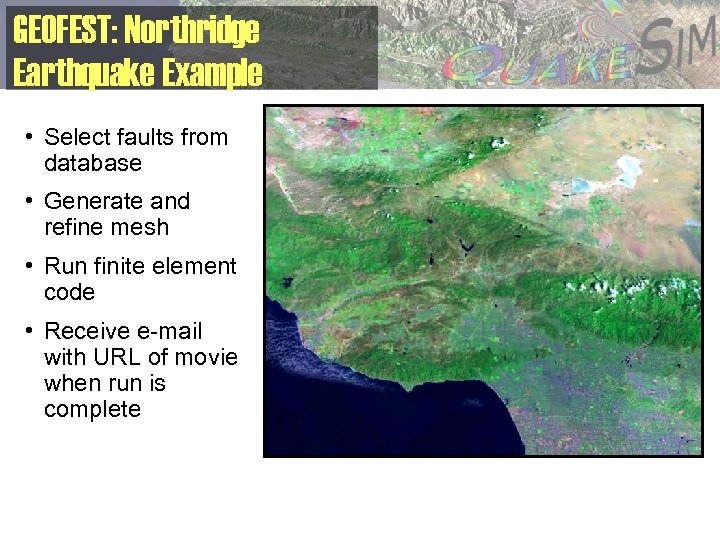 GEOFEST: Northridge Earthquake Example • Select faults from database • Generate and refine mesh • Run finite element code • Receive e-mail with URL of movie when run is complete