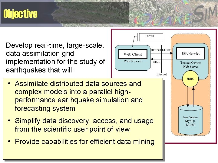 Objective Develop real-time, large-scale, data assimilation grid implementation for the study of earthquakes that will: • Assimilate distributed data sources and complex models into a parallel highperformance earthquake simulation and forecasting system • Simplify data discovery, access, and usage from the scientific user point of view • Provide capabilities for efficient data mining
