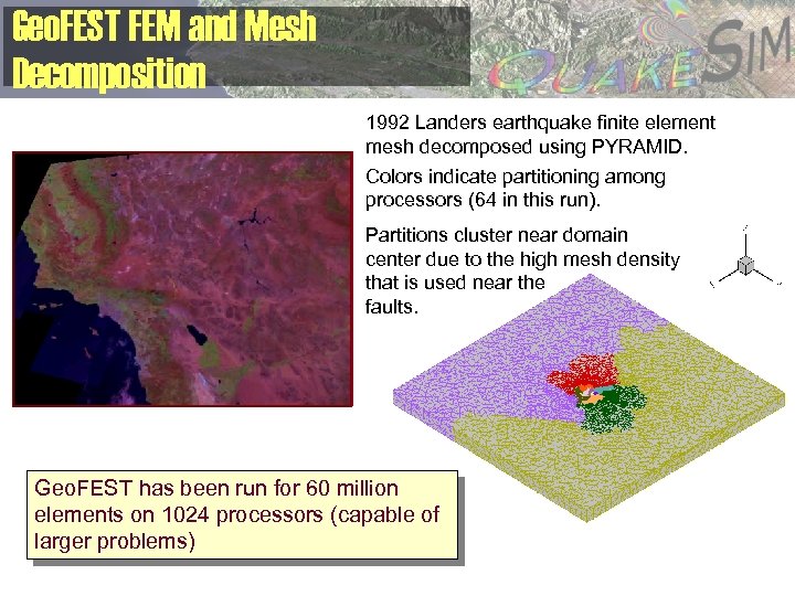 Geo. FEST FEM and Mesh Decomposition 1992 Landers earthquake finite element mesh decomposed using PYRAMID. Colors indicate partitioning among processors (64 in this run). Partitions cluster near domain center due to the high mesh density that is used near the faults. Geo. FEST has been run for 60 million elements on 1024 processors (capable of larger problems)