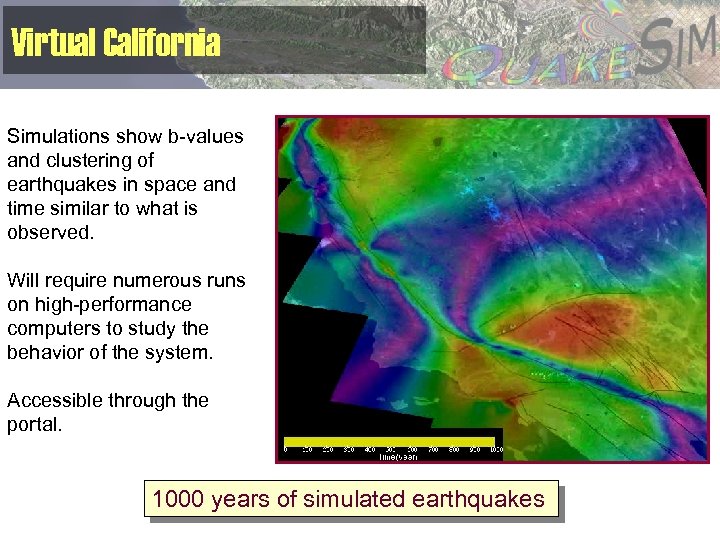 Virtual California Simulations show b-values and clustering of earthquakes in space and time similar to what is observed. Will require numerous runs on high-performance computers to study the behavior of the system. Accessible through the portal. 1000 years of simulated earthquakes