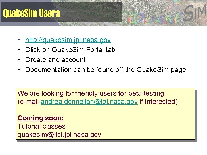 Quake. Sim Users • • http: //quakesim. jpl. nasa. gov Click on Quake. Sim Portal tab Create and account Documentation can be found off the Quake. Sim page We are looking for friendly users for beta testing (e-mail andrea. donnellan@jpl. nasa. gov if interested) Coming soon: Tutorial classes quakesim@list. jpl. nasa. gov