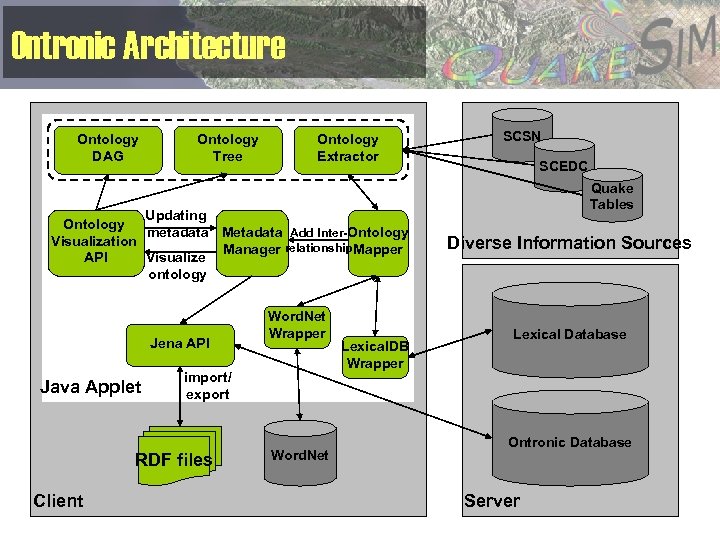 Ontronic Architecture Ontology DAG Ontology Tree Ontology Extractor Updating Ontology metadata Metadata Add Inter-Ontology Visualization Manager relationship Mapper API Visualize ontology Jena API Java Applet import/ export RDF files Client Word. Net Wrapper Word. Net Lexical. DB Wrapper SCSN SCEDC Quake Tables Diverse Information Sources Lexical Database Ontronic Database Server