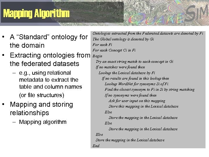 Mapping Algorithm • A “Standard” ontology for the domain • Extracting ontologies from the federated datasets – e. g. , using relational metadata to extract the table and column names (or file structures) • Mapping and storing relationships – Mapping algorithm Ontologies extracted from the Federated datasets are denoted by Fi The Global ontology is denoted by Gi For each Fi For each Concept Ci in Fi Begin Try an exact string match to each concept in Gi If no matches were found then Lookup the Lexical database by Fi If no results are found in this lookup then Lookup Word. Net for synonyms Si of Fi Find the closest synonym to Fi in Si by string matching If no synonyms were found then Ask for user input on this mapping Store this mapping in the Lexical database Else Store the mapping in the Lexical database End