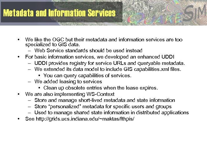 Metadata and Information Services • • We like the OGC but their metadata and information services are too specialized to GIS data. – Web Service standards should be used instead For basic information services, we developed an enhanced UDDI – UDDI provides registry for service URLs and queryable metadata. – We extended its data model to include GIS capabilities. xml files. • You can query capabilities of services. – We added leasing to services • Clean up obsolete entries when the lease expires. We are also implementing WS-Context – Store and manage short-lived metadata and state information – Store “personalized” metadata for specific users and groups – Used to manage shared state information in distributed applications See http: //grids. ucs. indiana. edu/~maktas/fthpis/