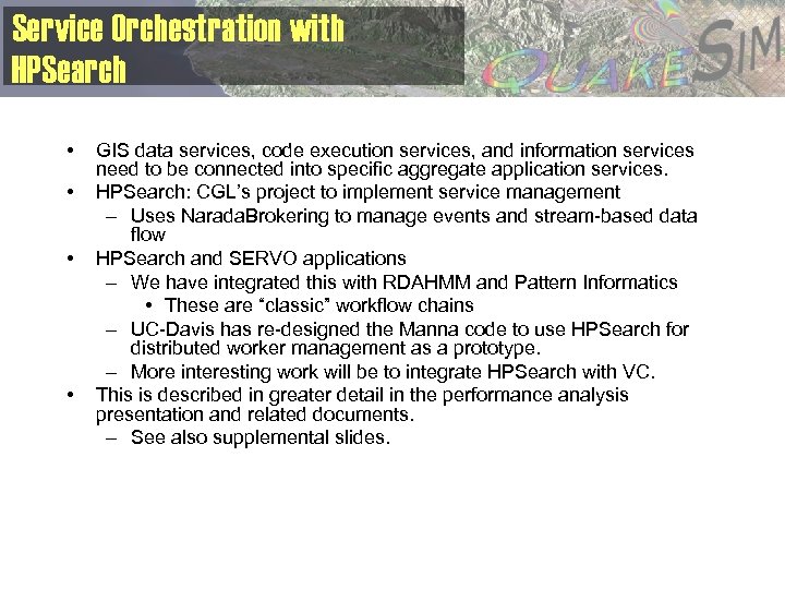 Service Orchestration with HPSearch • • GIS data services, code execution services, and information services need to be connected into specific aggregate application services. HPSearch: CGL’s project to implement service management – Uses Narada. Brokering to manage events and stream-based data flow HPSearch and SERVO applications – We have integrated this with RDAHMM and Pattern Informatics • These are “classic” workflow chains – UC-Davis has re-designed the Manna code to use HPSearch for distributed worker management as a prototype. – More interesting work will be to integrate HPSearch with VC. This is described in greater detail in the performance analysis presentation and related documents. – See also supplemental slides.