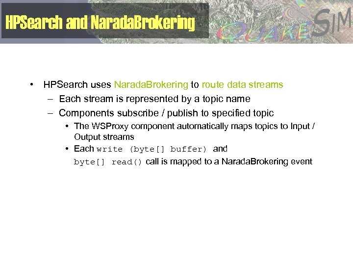 HPSearch and Narada. Brokering • HPSearch uses Narada. Brokering to route data streams – Each stream is represented by a topic name – Components subscribe / publish to specified topic • The WSProxy component automatically maps topics to Input / Output streams • Each write (byte[] buffer) and byte[] read() call is mapped to a Narada. Brokering event