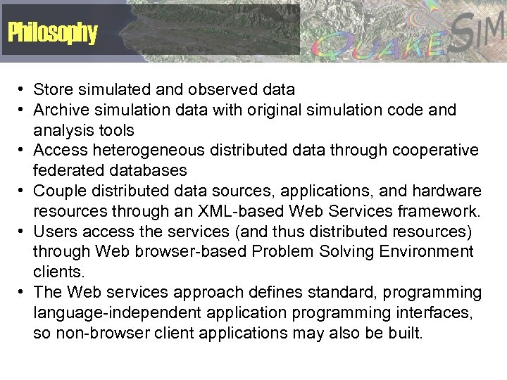 Philosophy • Store simulated and observed data • Archive simulation data with original simulation code and analysis tools • Access heterogeneous distributed data through cooperative federated databases • Couple distributed data sources, applications, and hardware resources through an XML-based Web Services framework. • Users access the services (and thus distributed resources) through Web browser-based Problem Solving Environment clients. • The Web services approach defines standard, programming language-independent application programming interfaces, so non-browser client applications may also be built.