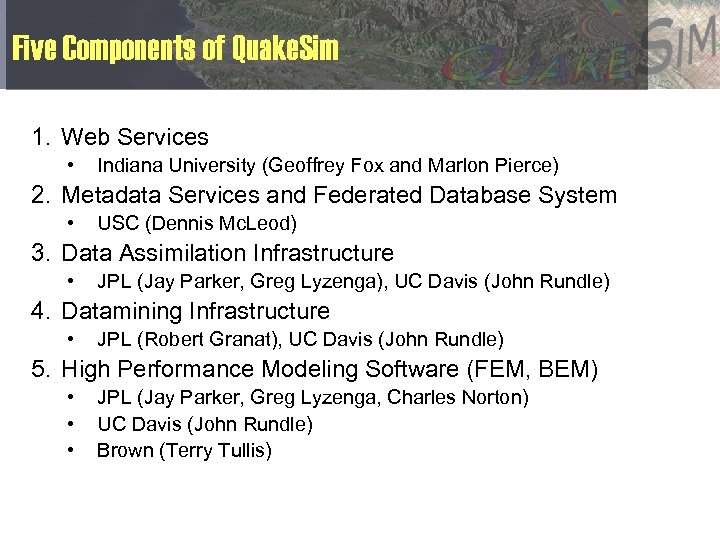 Five Components of Quake. Sim 1. Web Services • Indiana University (Geoffrey Fox and Marlon Pierce) 2. Metadata Services and Federated Database System • USC (Dennis Mc. Leod) 3. Data Assimilation Infrastructure • JPL (Jay Parker, Greg Lyzenga), UC Davis (John Rundle) 4. Datamining Infrastructure • JPL (Robert Granat), UC Davis (John Rundle) 5. High Performance Modeling Software (FEM, BEM) • • • JPL (Jay Parker, Greg Lyzenga, Charles Norton) UC Davis (John Rundle) Brown (Terry Tullis)