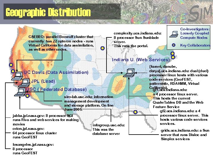 Geographic Distribution CSEBEO: parallel Beowulf cluster that currently has 22 opteron nodes - runs Virtual California for data assimilation, as well as other codes. complexity. ucs. indiana. edu: 8 processor Sunblade server. This runs the portal. Co-Investigators: Loosely Coupled Compute Nodes Key Collaborators Indiana U. (Web Services) UC Davis (Data Assimilation) JPL (Lead) USC ( Federated Database) siro-lab. usc. edu: information management development and storage platform. On line June 2005. jabba. jpl. nasa. gov: 8 processor SGI runs Riva and web services for making movies orion. jpl. nasa. gov: 64 processor linux cluster runs Geo. FEST losangeles. jpl. nasa. gov: 8 processor runs Geo. FEST infogroup. usc. edu: This was the database server {kamet, danube, darya}. ucs. indiana. edu: dual (duel) processor linux hosts with various code services (Geo. FEST, patterninfo, RDAHMM, Virtual California). gf 1. ucs. indiana. edu: a 4 processor linux server. This hosts the current Quake. Tables DB and the Web Feature Service gf 2. ucs. indiana. edu: a 4 processor linux server. This hosts various code services. grids. ucs. indiana. edu: a Sun server that runs Disloc and Simplex services