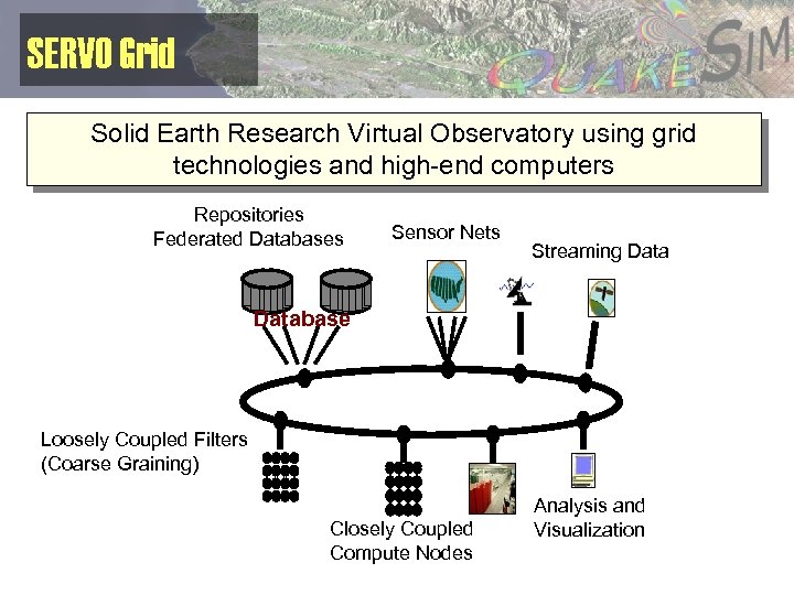 SERVO Grid Solid Earth Research Virtual Observatory using grid technologies and high-end computers Repositories Federated Databases Sensor Nets Streaming Database Loosely Coupled Filters (Coarse Graining) Closely Coupled Compute Nodes Analysis and Visualization