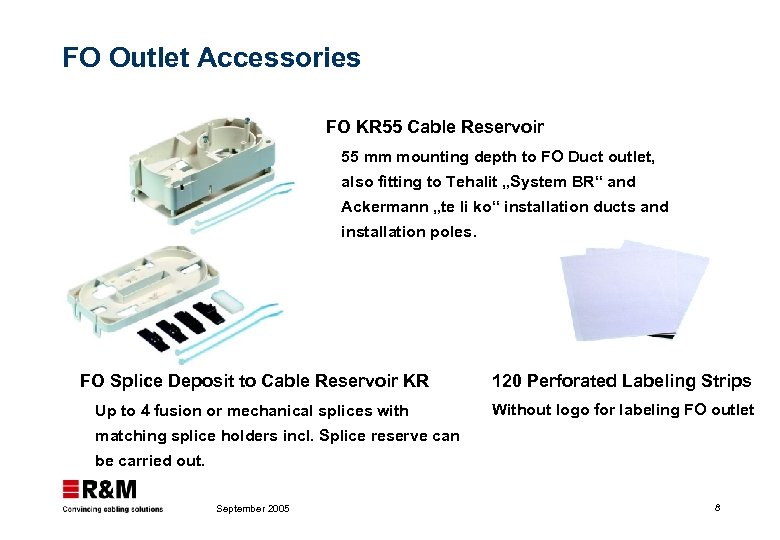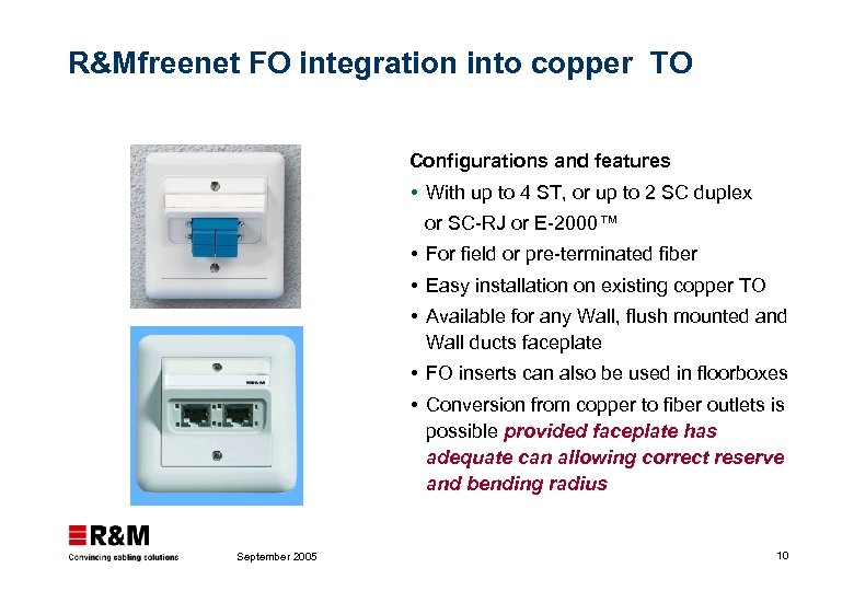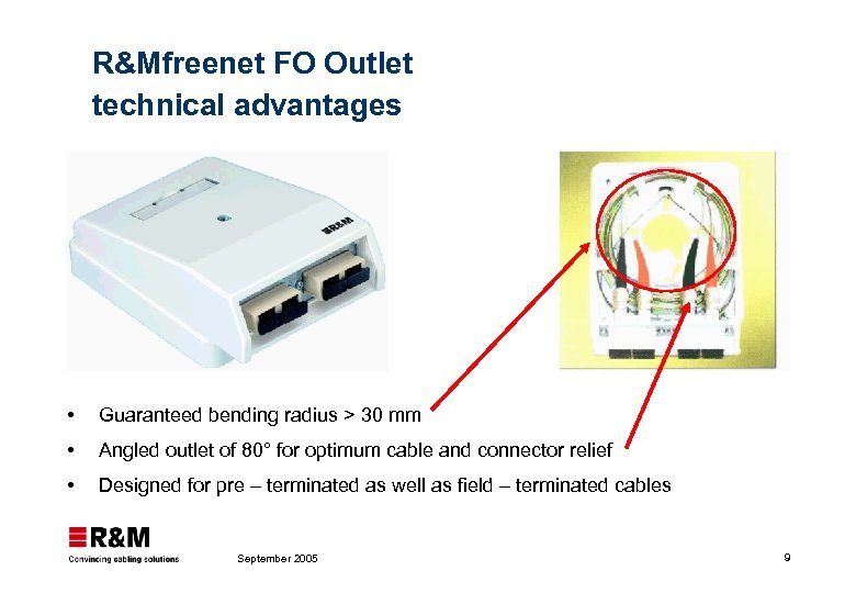 R&Mfreenet FO Outlet technical advantages Guaranteed bending radius > 30 mm Angled outlet of 80° for optimum cable and connector relief Designed for pre – terminated as well as field – terminated cables September 2005 9