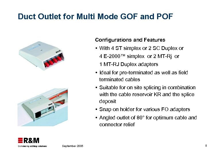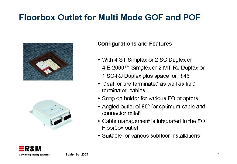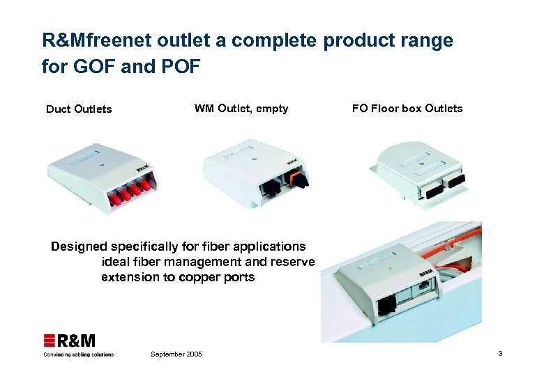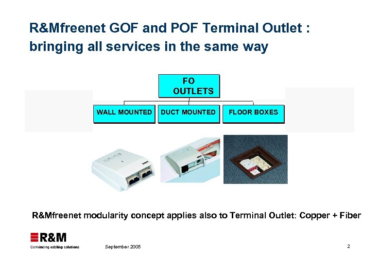 R&Mfreenet GOF and POF Terminal Outlet : bringing all services in the same way FO OUTLETS WALL MOUNTED DUCT MOUNTED FLOOR BOXES SPECIAL MUTOA, CP R&Mfreenet modularity concept applies also to Terminal Outlet: Copper + Fiber September 2005 2