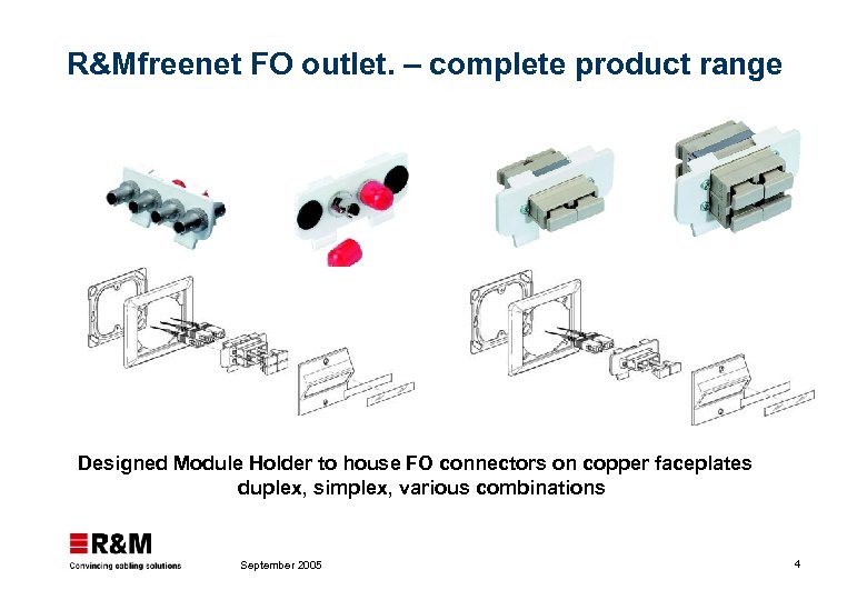 R&Mfreenet FO outlet. – complete product range Designed Module Holder to house FO connectors on copper faceplates duplex, simplex, various combinations September 2005 4
