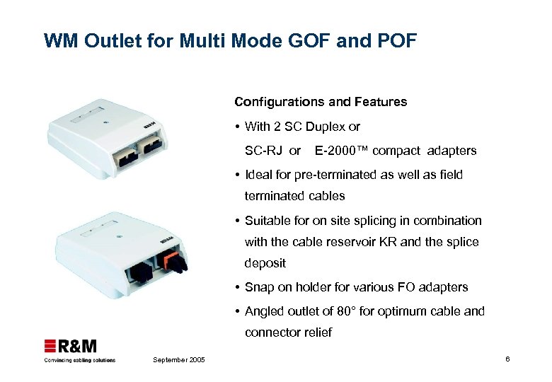 WM Outlet for Multi Mode GOF and POF Configurations and Features With 2 SC Duplex or SC-RJ or E-2000™ compact adapters Ideal for pre-terminated as well as field terminated cables Suitable for on site splicing in combination with the cable reservoir KR and the splice deposit Snap on holder for various FO adapters Angled outlet of 80° for optimum cable and connector relief September 2005 6