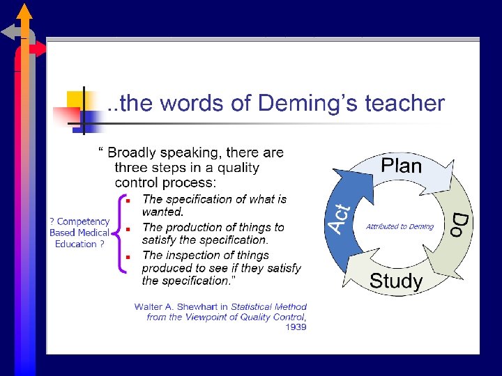 Quality Improvement W. Edwards Deming • American statistician, professor, author, lecturer, and consultant • Improved production in the U. S. during World War II and in Japan after the war • Pioneer – use of statistical analysis to achieve better industrial quality control – ‘quality movement’
