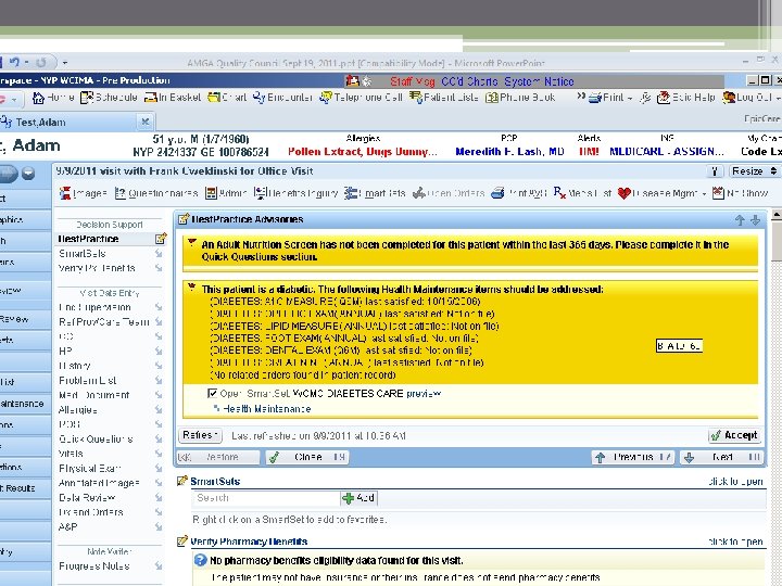 Automated Measures • PQRS Measure #6: CAD Anti-platelet Therapy ▫ System checks medication list and/or orders • PQRS Measure #39: Osteoporosis Screening ▫ System checks orders or test results • PQRS Measure #130: Medication Review ▫ System checks medication list ▫ Physician must “click” Review Button • MU Measure #421: Adult Weight Screening ▫ System calculates BMI; Alert if outside parameters • MU Measure #28 a & 28 B: Tobacco Inquiry ▫ System looks in Social History Section