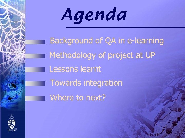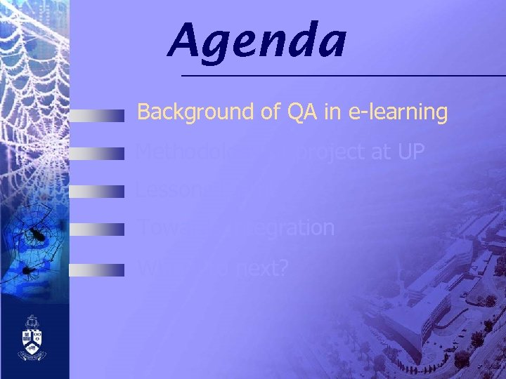 Agenda Background of QA in e-learning Methodology of project at UP Lessons learnt Towards integration Where to next?