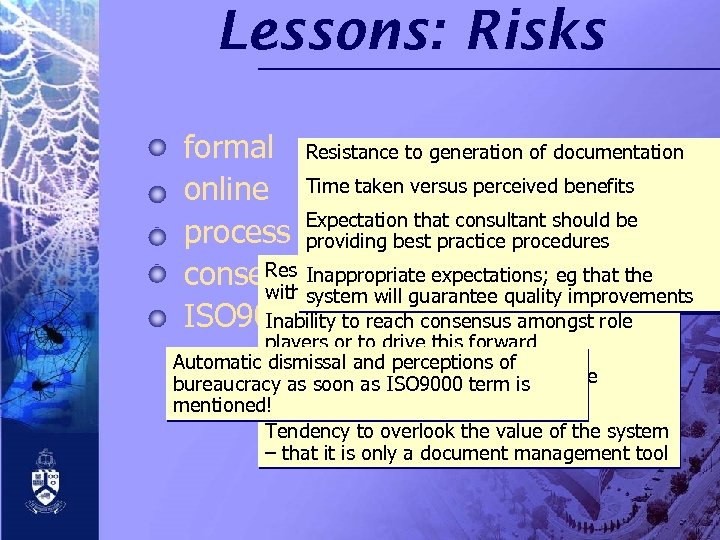 Lessons: Risks formal Resistance to generation of documentation versus perceived benefits online Time takenpressures for development of Work load Expectation that consultant should be online system process based best practice procedures providing Once created, it must be maintained and kept Resistance to ideasexpectations; process; associated Inappropriate to driven ofinternal functionality and consensusup to date forinappropriateeg that the with system will and commerce guarantee quality to HE? improvements external visibility ISO 9000 cognisant Inability to reach consensus amongst role players or to drive this forward Automatic dismissal and perceptions of Expectation that consultant is bureaucracy as soon as ISO 9000 term should be providing ‘answers’ mentioned! Tendency to overlook the value of the system – that it is only a document management tool