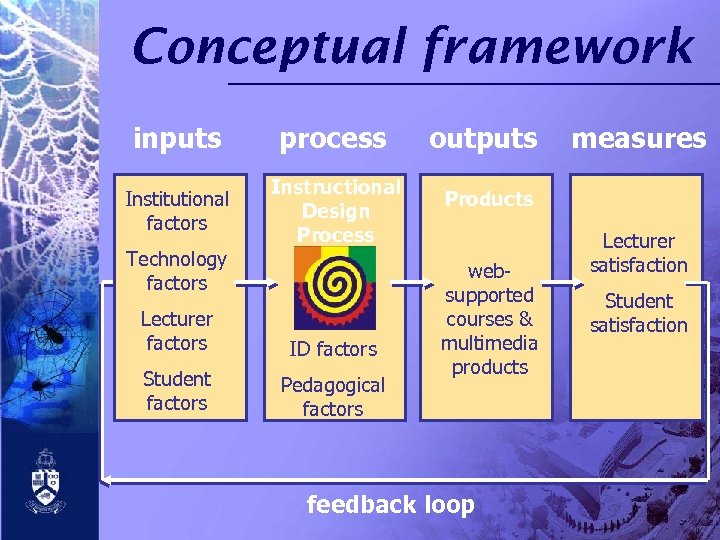 Conceptual framework inputs process Institutional factors Instructional Design Process Technology factors Lecturer factors ID factors Student factors Pedagogical factors outputs measures Products websupported courses & multimedia products feedback loop Lecturer satisfaction Student satisfaction