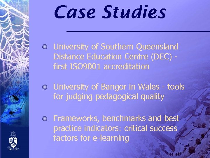 Case Studies University of Southern Queensland Distance Education Centre (DEC) first ISO 9001 accreditation University of Bangor in Wales - tools for judging pedagogical quality Frameworks, benchmarks and best practice indicators: critical success factors for e-learning