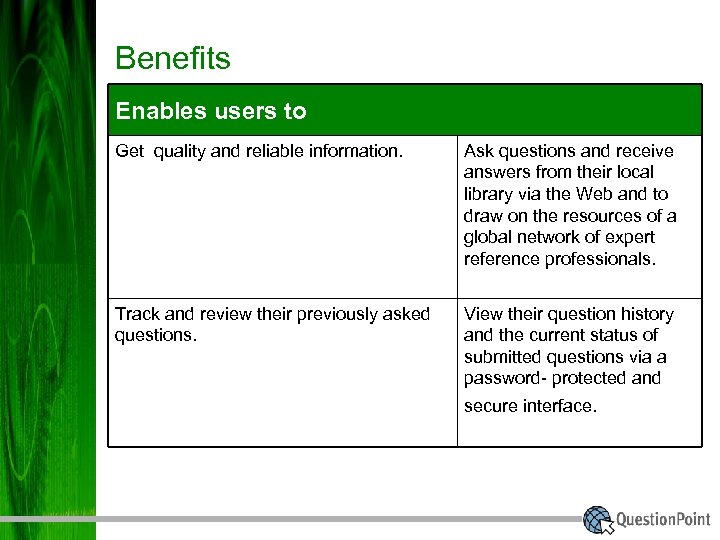 Benefits Enables users to Get quality and reliable information. Ask questions and receive answers from their local library via the Web and to draw on the resources of a global network of expert reference professionals. Track and review their previously asked questions. View their question history and the current status of submitted questions via a password- protected and secure interface.