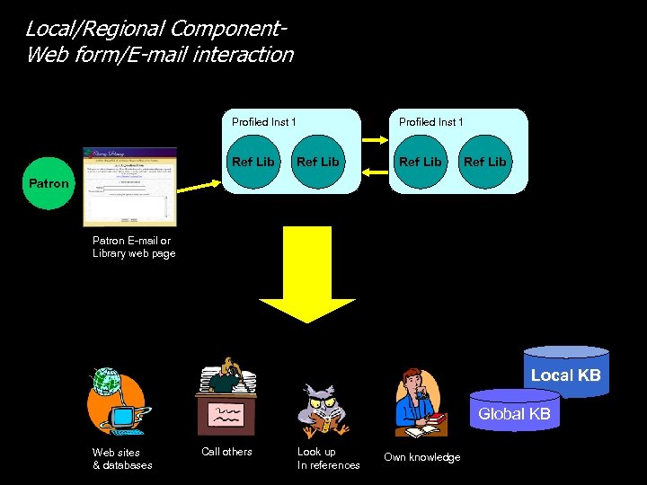Local/Regional Component. Web form/E-mail interaction Profiled Inst 11 Ref Lib Profiled Inst 2 Profiled Inst 1 Ref Lib Ref Lib Patron E-mail or Library web page Local KB Global KB Web sites & databases Call others Look up In references Own knowledge