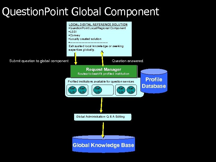 Question. Point Global Component LOCAL DIGITAL REFERENCE SOLUTION • Question. Point Local/Regional Component • LSSI • Convey • Locally created solution • -------------------Exhausted local knowledge or seeking expertise globally. Submit question to global component Question answered. Request Manager Routes to best-fit profiled institution Profiled institutions available for question services Ref Lib Ref Lib Global Administration- Q & A Editing Global Knowledge Base Profile Database