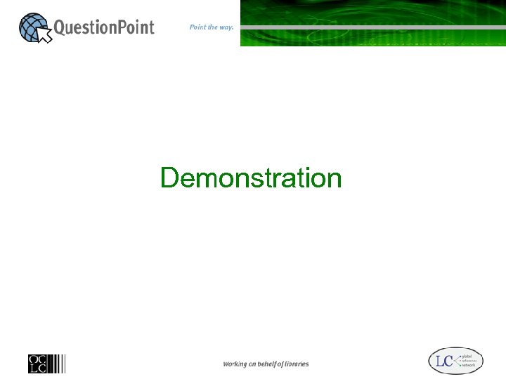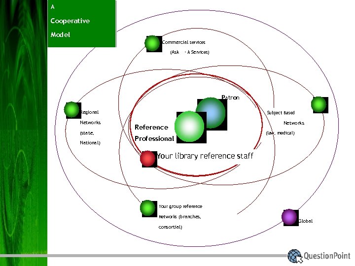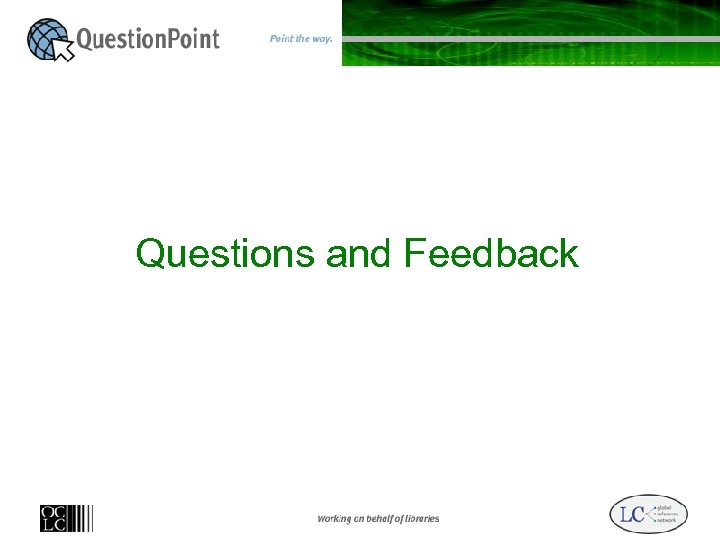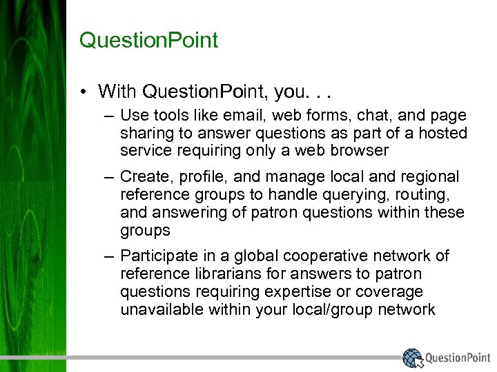 Question. Point • With Question. Point, you. . . – Use tools like email, web forms, chat, and page sharing to answer questions as part of a hosted service requiring only a web browser – Create, profile, and manage local and regional reference groups to handle querying, routing, and answering of patron questions within these groups – Participate in a global cooperative network of reference librarians for answers to patron questions requiring expertise or coverage unavailable within your local/group network