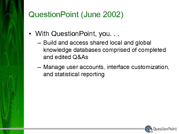 Question. Point (June 2002) • With Question. Point, you. . . – Build and access shared local and global knowledge databases comprised of completed and edited Q&As – Manage user accounts, interface customization, and statistical reporting