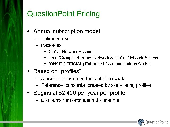 Question. Point Pricing • Annual subscription model – Unlimited use – Packages • Global Network Access • Local/Group Reference Network & Global Network Access • (ONCE OFFICIAL) Enhanced Communications Option • Based on “profiles” – A profile = a node on the global network – Reference “consortia” created by associating profiles • Begins at $2, 400 per year per profile – Discounts for contribution & consortia
